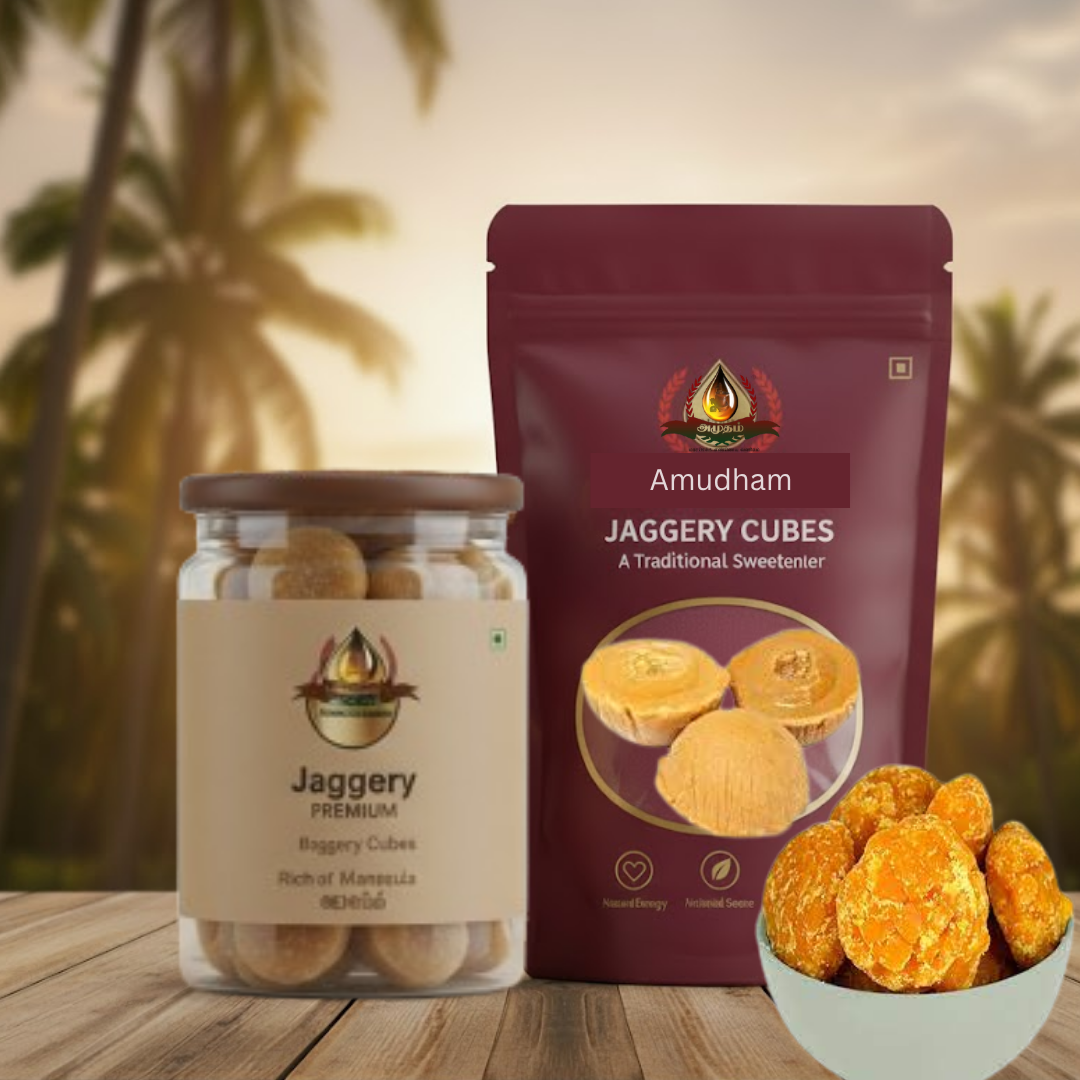 Palm jaggery is rich, dark, and contains a unique earthy taste. It is known for its medicinal properties and is widely used in traditional Tamil cuisine.